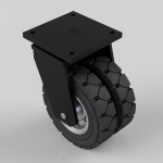 Fabricated black painted swivel castor plate fixing fitted with a black elastic rubber tyred on a steel disc centred wheel with ball bearings and wheel only brake, Wheel diameter 2 x 406mm, tread width 2 x 104mm, overall height 535mm, plate size 315mm x 315mm, hole centres 250mm x 250mm. 1900kg at 4kph and 860kg at 16kph. **MANUFACTURED TO ORDER**