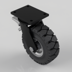 Fabricated black painted swivel castor plate fixing fitted with a black elastic rubber tyred on a steel disc centred wheel with ball bearings and wheel only brake, Wheel diameter 250mm, tread width 84mm, overall height 305mm, plate size 175mm x 140mm, hole centres 140mm x 105mm. Load capacity 450kg at 4kph, 200kg at 16kph. **MANUFACTURED TO ORDER**