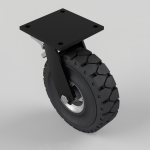 Fabricated black painted swivel castor plate fixing fitted with a black elastic rubber tyred on a steel disc centred wheel with ball bearings and wheel only brake, Wheel diameter 306mm, tread width 93mm, overall height 375mm, plate size 200mm x 200mm, hole centres 160mm x 160mm. Load capacity 550kg at 4kph and 240 at 16kph