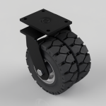 Fabricated black painted swivel castor plate fixing fitted with a black elastic rubber tyred on a steel disc centred wheel with ball bearings, Wheel diameter 2 x 250mm, tread width 2 x 84mm, overall height 305mm, plate size 175mm x 140mm, hole centres 140mm x 105mm. Load capacity 900kg at 4kph and 400kg at 16kph. **MANUFACTURED TO ORDER**