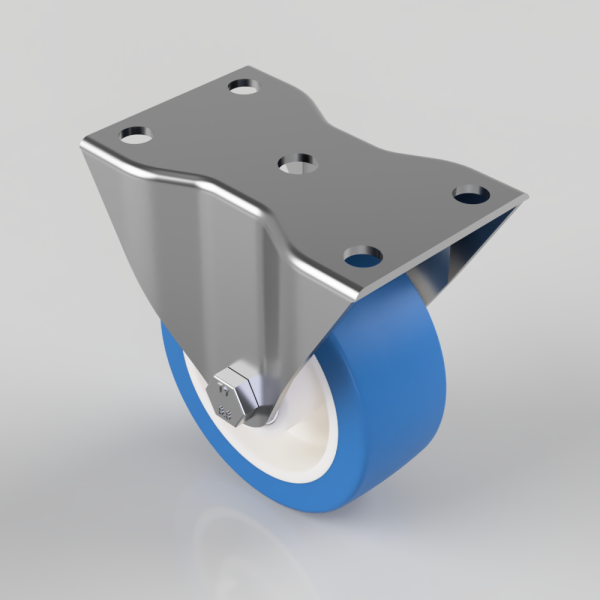 Pressed steel fixed castor with a top plate fixing fitted with a blue 82 shore A polyurethane tyre on white nylon centre wheel with roller bearings. Wheel diameter 100mm, tread width 40mm, overall height 127mm, top plate 122mm x 77mm, hole centres 100mm x 48mm Load capacity 250kg.Please note the tyre is flat and designed for floor protection but this may increase tractive resistance.