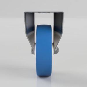 Pressed steel fixed castor with a top plate fitted with a 82 shore A blue polyurethane tyre white nylon centred wheel with plain bore. Wheel diameter 125mm, tread width 35mm, overall height 155mm, top plate 105mm x 85mm, hole centres 80mm x 60mm. Load capacity 200kg.