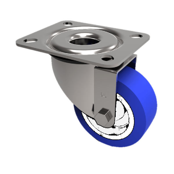 Pressed steel swivel castor with a top plate fixing fitted with a blue 82 shore A polyurethane tyre on white nylon centre wheel with roller bearings. Wheel diameter 100mm, tread width 40mm, overall height 128mm, top plate 105mm x 86mm, hole centres 80mm x 60mm Load capacity 250kg. Please note the tyre is flat and designed for floor protection but this may increase tractive resistance.