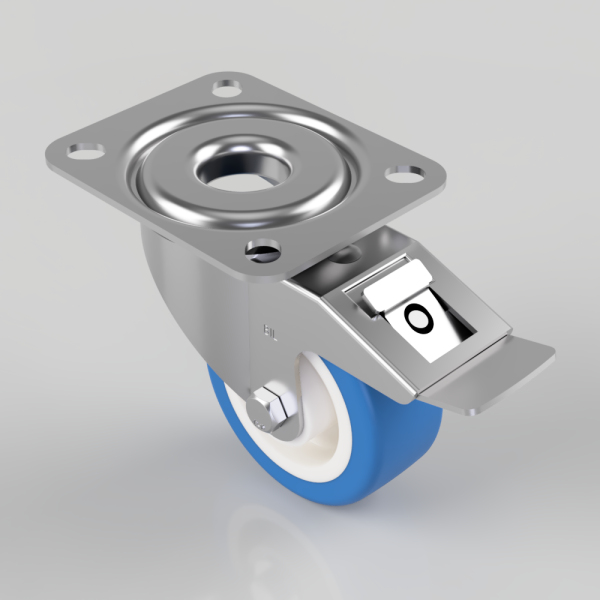 Grade 304 Pressed stainless steel swivel swivel castor top plate fixing fitted with a 82 shore A blue elastic polyurethane on white nylon centred wheel with a roller bearing and a total lock brake. Wheel diameter 80mm, tread width 33mm, overall height 105mm, top plate 105mm x 85mm, hole centres 80mm x 60mm. Load capacity 150kg.