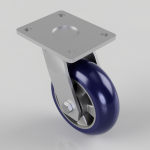 Fabricated steel swivel castor with a top plate fixing fitted with a blue 75 shore A ergonomic polyurethane tyre on aluminium centred wheel with ball bearings. Wheel diameter 150mm, tread width 50mm, overall height 190mm, top plate 138mm x 110mm, hole centres 105mm x 80mm/75mm. Load capacity 500kg at 4kph, 225kg at 10kph, 200kg at 16kph.
