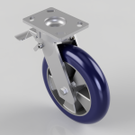 Fabricated swivel castor with a top plate fixing fitted with a ergonomic blue 75 shore A polyurethane tyred aluminium centred ball bearing wheel and total lock brake. Wheel diameter 250mm, tread width 50mm, overall height 300mm, top plate 150mm x 110mm, hole centres 105mm x 80mm or 121mm x 59mm. Load capacity 800kg at 4KPH 320kg at 16KPH